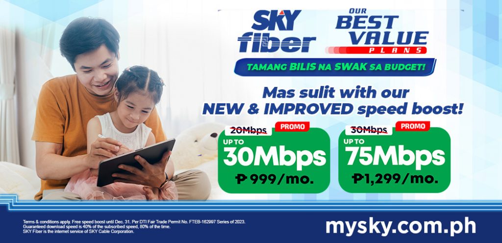 In this upcoming promo, subscribers of SKY Fiber’s Plan 20Mbps (P999/month) will experience speeds of up to 30Mbps at no additional cost to their monthly subscription fee. Additionally, subscribers of Plan 30Mbps (P1,299/month) will get boosted speeds of up to 75Mbps for free, except for those located in Batangas, Dumaguete, and Iloilo who’ll continue to receive up to 45Mbps free speed boost until December 31.